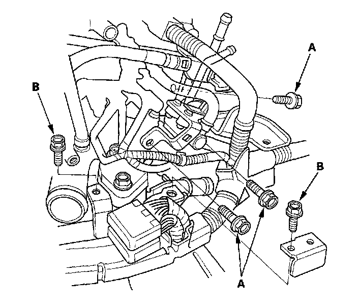14. Remove the three bolts (A) securing the EVAP canister purge valve bracket and remove the two bolts (B) securing the harness bracket.