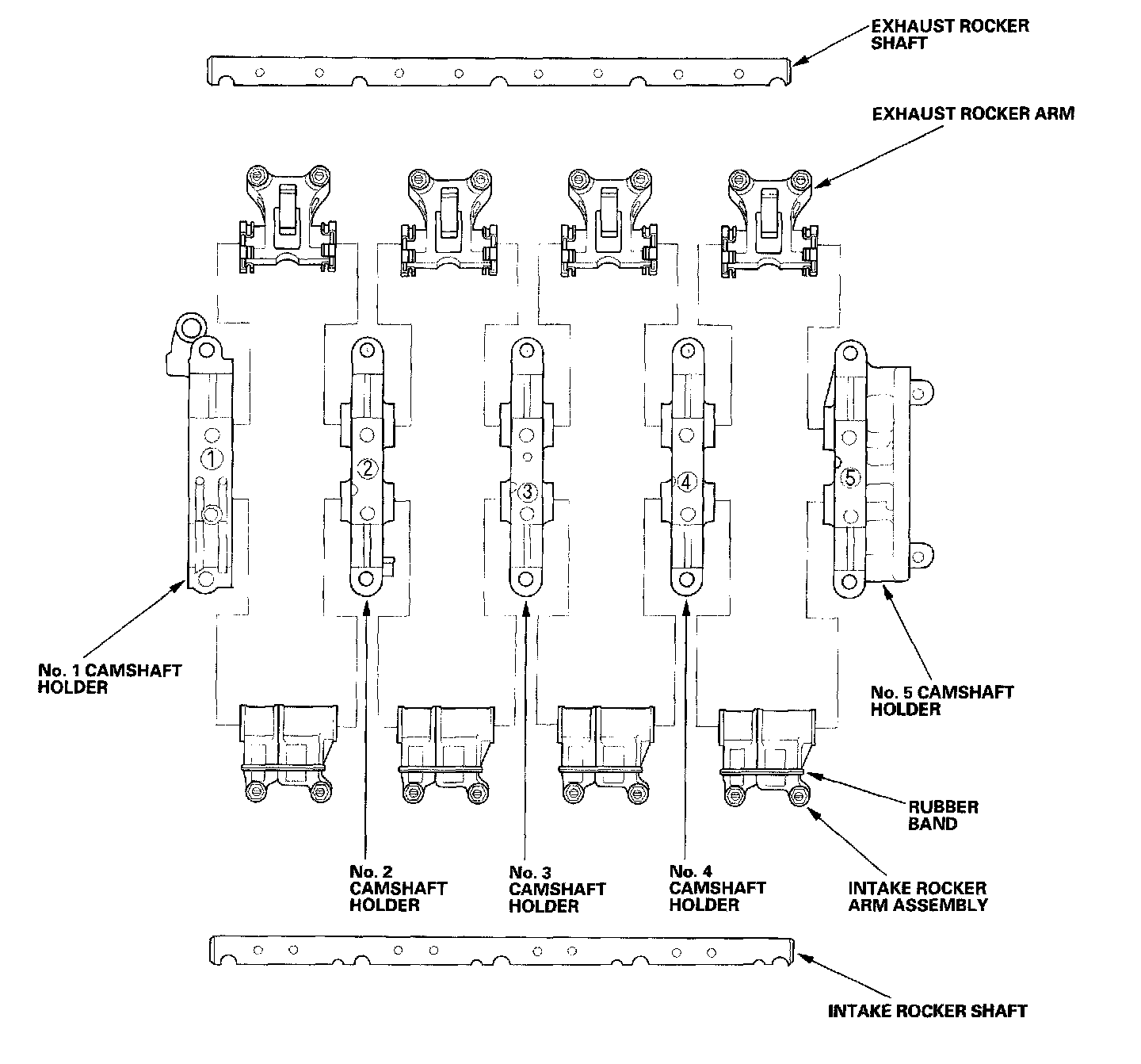 - When removing or installing the rocker arm assembly, do not remove the camshaft holder bolts. The bolts will keep the holders and rocker arms on the shaft.