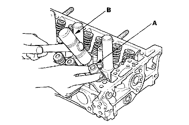 2. Using an appropriate-sized socket (A) and plastic mallet (B), lightly tap the valve retainer to loosen the valve keepers.