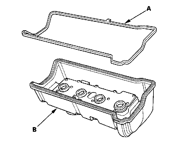 2. Install the head cover gasket (A) in the groove of the cylinder head cover (B).