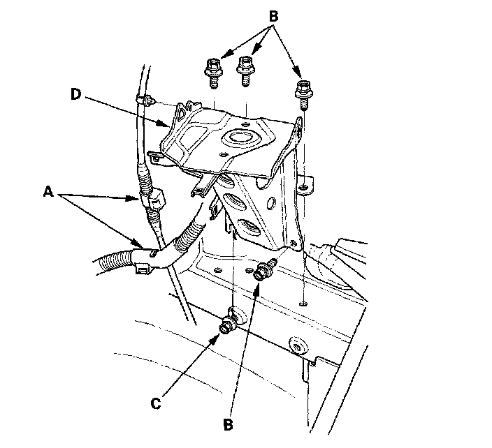 9. Remove the four bolts (B), and loosen the bolt (C) securing the battery base, then remove the battery base (D).