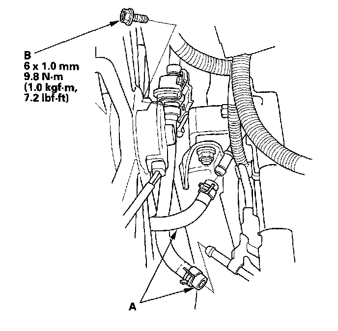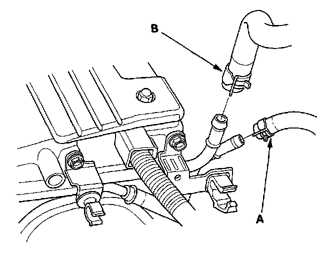 15. Remove the Evaporative Emission (EVAP) canister hose (A) and brake booster vacuum hose (B).