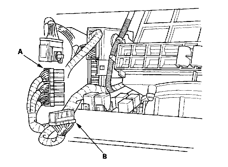 16. Disconnect the Engine Control Module (ECM)/ Powertrain Control Module (PCM) connectors (A) and main wire harness connector (B).