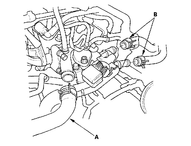 38. Remove the upper radiator hose (A) and heater hoses (B).