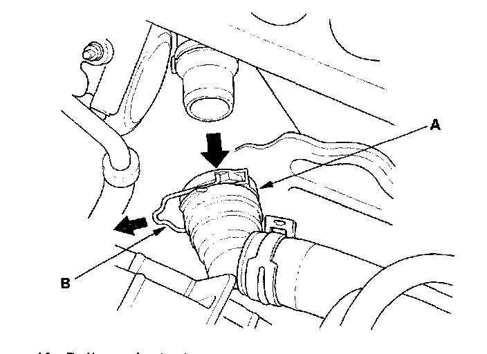 40. Pull out the lock (B) by hand, then wiggle the quick connector to remove it from the thermostat cover. Do not use any tools to remove the quick connector.