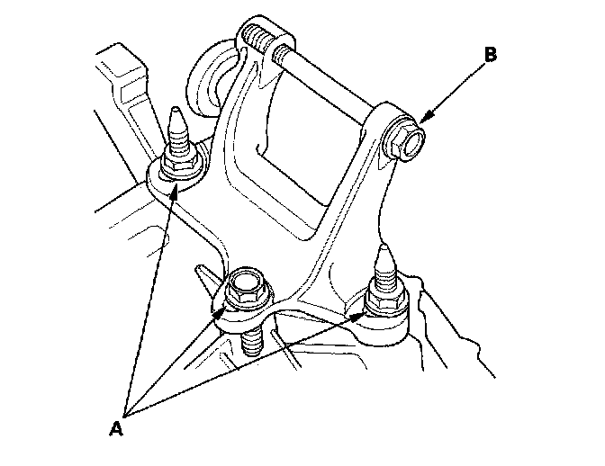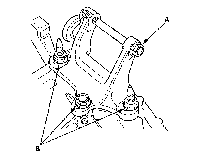 14. Remove and discard the transmission mount mounting bolt (A), and loosen the transmission mount bracket support bolt/nuts (B) (A/T).