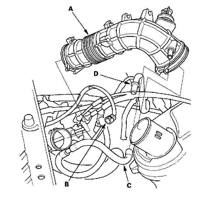 5. Remove the vacuum hose (B) and breather pipe (C), then remove the intake air duct (D).