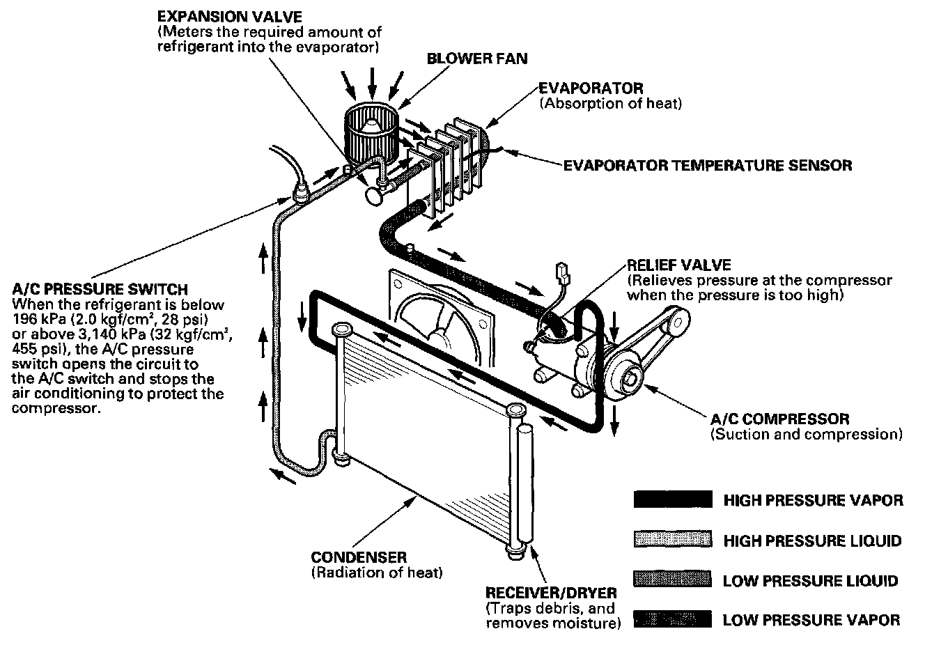 - All A/C system parts (compressor, discharge line, suction line, evaporator, condenser, receiver/dryer, expansion valve, O-rings for joints) are designed for refrigerant R-134a. Do not exchange with R-12 parts.