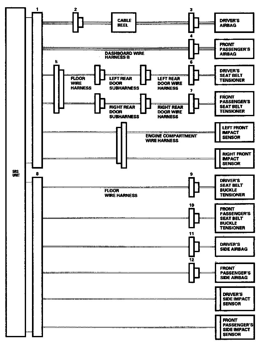 - Before disconnecting SRS unit connector B (8) from the SRS unit, disconnect both side airbag 2P connectors (11, 12), and both seat belt buckle tensioner 4P connectors (9, 10).
