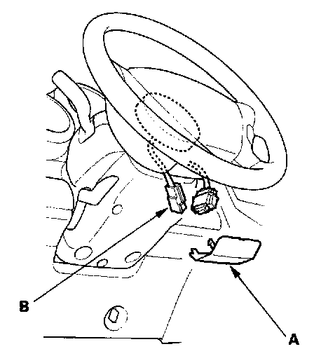 2. Remove the access panel (A) from the steering wheel, then disconnect the driver's airbag 4P connector (B) from the cable reel.