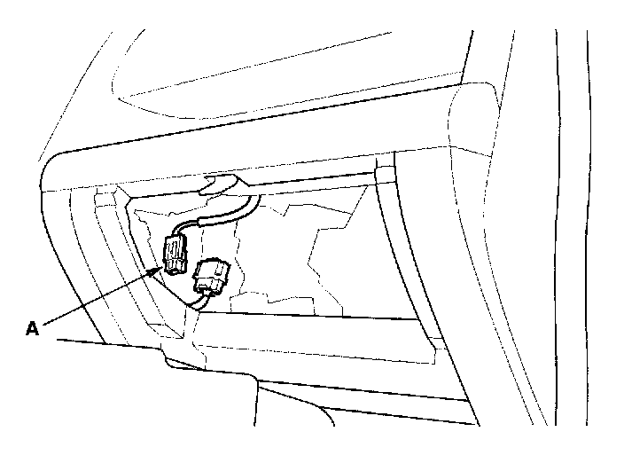 3. Remove the glove box, then disconnect the front passenger's airbag 4P connector (A) from dashboard wire harness B.