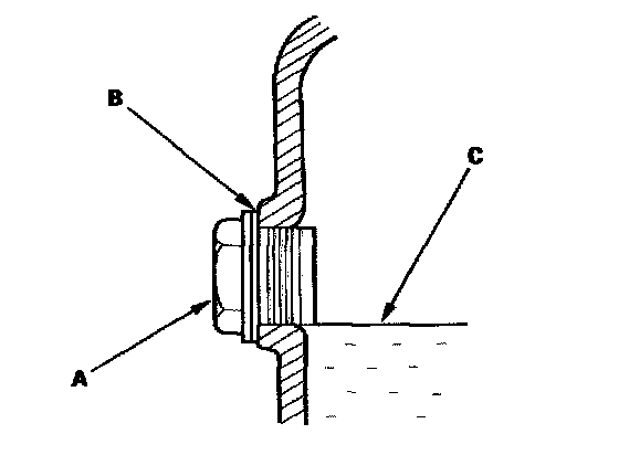 2. Remove the oil filler plug (A) and washer (B), check the condition of the fluid, and make sure it is at the proper level (C).