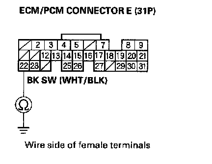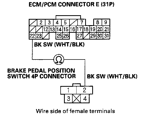 9. Check for continuity between ECM/PCM connector terminal E22 and brake pedal position switch 4P connector terminal No.2.