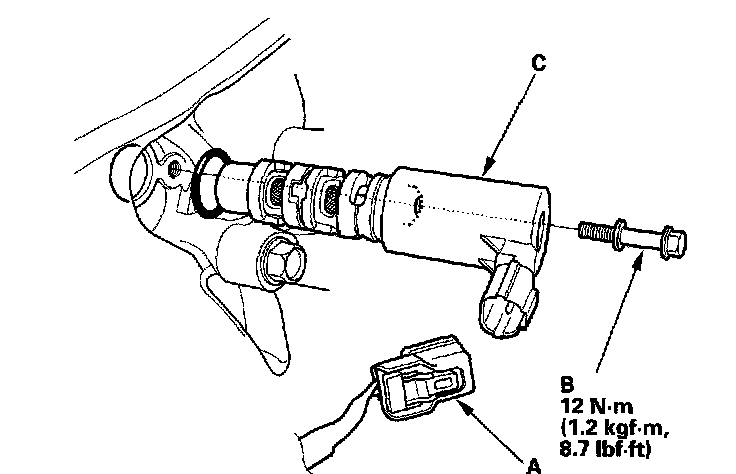 2. Remove the bolt (B) and the VTC oil control solenoid valve (C).