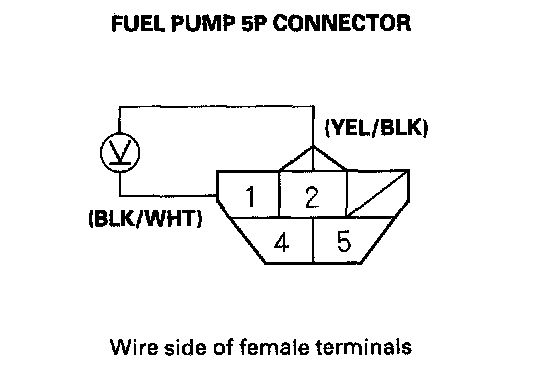7. Measure voltage between fuel pump 5P connector terminals No.1 and No.2 with the ignition switch ON (II). There should be battery voltage.