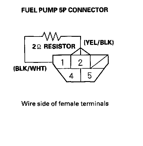 9. Install a 2 Ohms resistor between fuel pump 5P connector terminals No.1 and No.2, then turn the ignition switch ON (II).