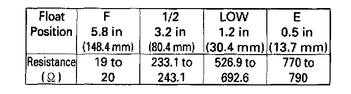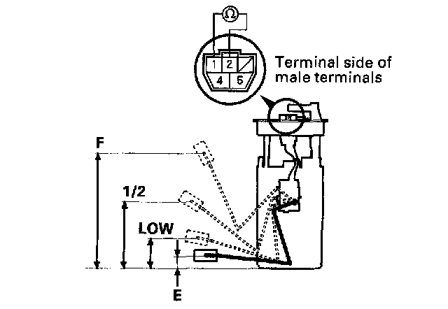 12. Measure the resistance between the No.1 and No.2 terminals of the fuel gauge sending unit with the float at E (EMPTY), 1/2 (HALF FULL), and F (FULL) positions.