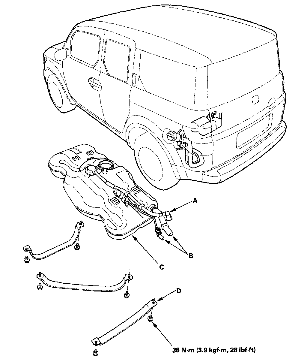 3. Disconnect the filler neck, the fuel vapor hose (A), and hoses (B). Slide back the clamps, then twist the hoses as you pull to avoid damaging them.