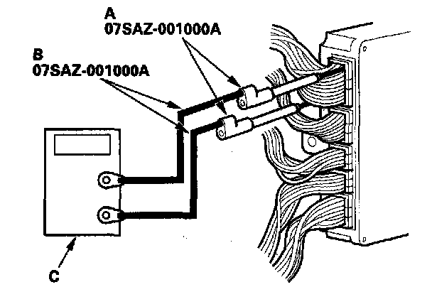 9. Connect the backprobe adapters (A) to the stacking patch cords (B), and connect the cords to a multimeter (C).