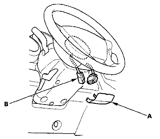 2. Remove the access panel (A) from the steering wheel, then disconnect the driver's airbag 4P connector (B) from the cable reel.