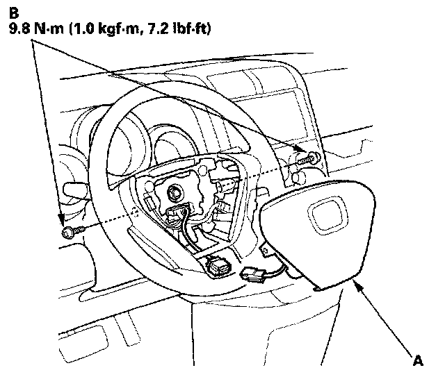 1. Place the new driver's airbag (A) in the steering wheel, and secure it with new Torx bolts (B).