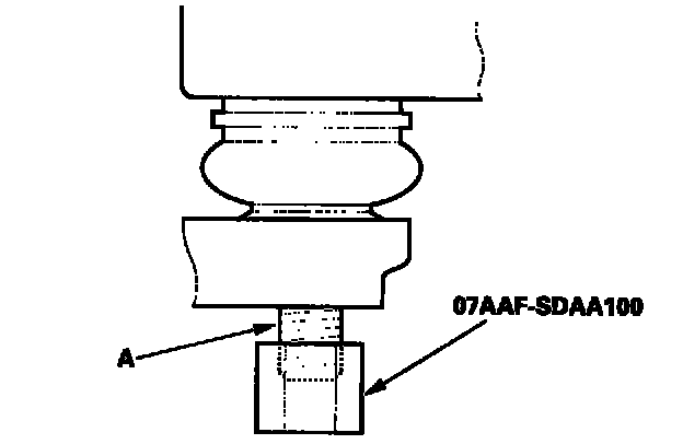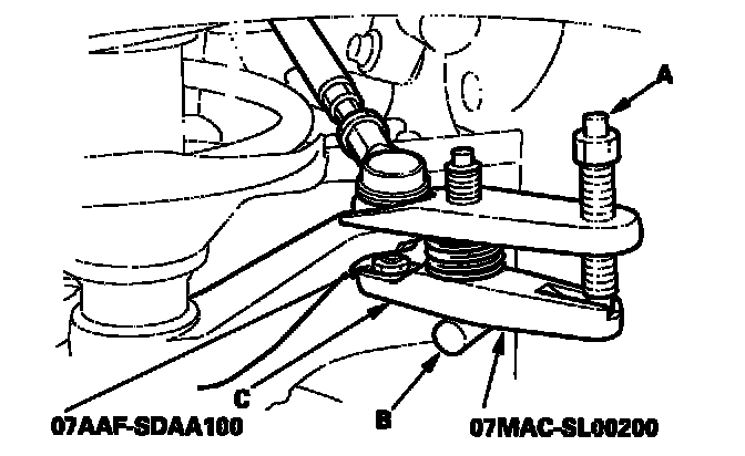 3. Loosen the pressure bolt (A), and install the special tool as shown. Insert the jaws carefully, making sure not to damage the ball joint boot. Adjust the jaw spacing by turning the adjusting bolt (B).