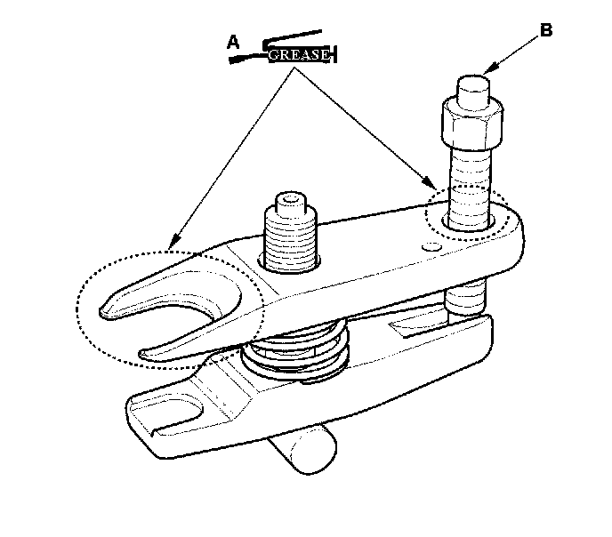 2. Apply grease to the special tool on the areas shown (A). This will ease installation of the tool and prevent damage to the pressure bolt (B) threads.