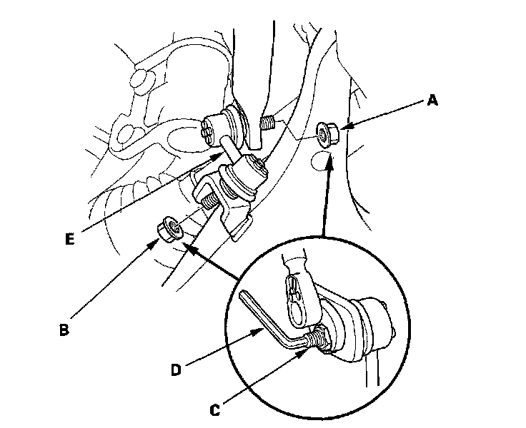2. Remove the self-locking nut (A) and flange nut (B) while holding the respective joint pin (C) with a hex wrench (D), and remove the stabilizer link (E).