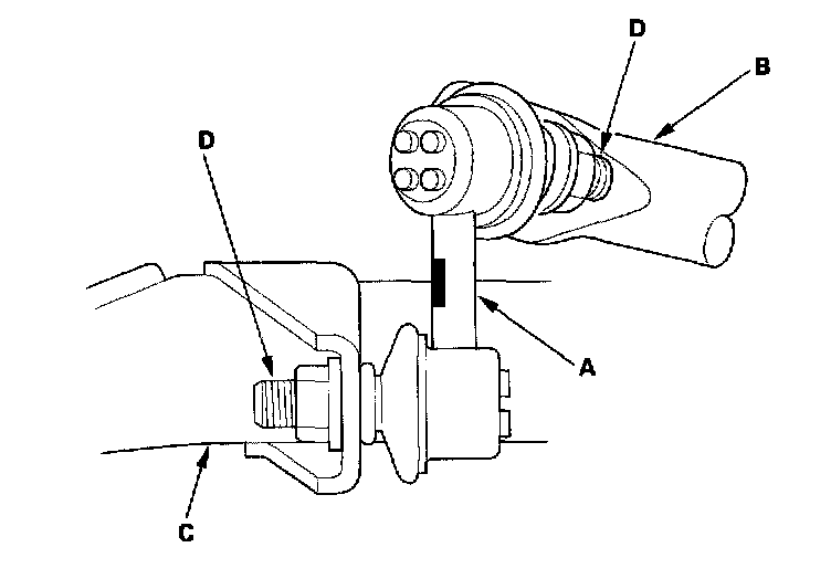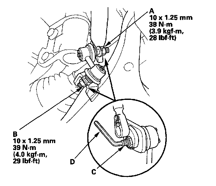 3. Install the stabilizer link (A) on the stabilizer bar (B) and lower arm (C) with the joint pins (D) set at the center of their range of movement.