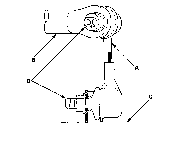 3. Install the stabilizer link (A) on the stabilizer bar (B) and trailing arm (C) with the joint pins (D) set at the center of their range of movement.