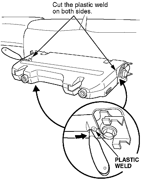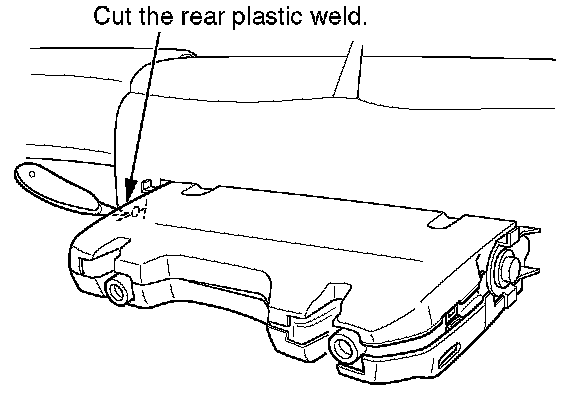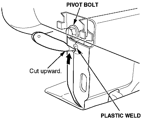 7. Wearing gloves and eye protection, carefully cut the plastic weld on the rear of the seat support covers with a utility knife. To cut the weld, insert the blade into the gap below the weld, and move the knife toward the pivot bolt.