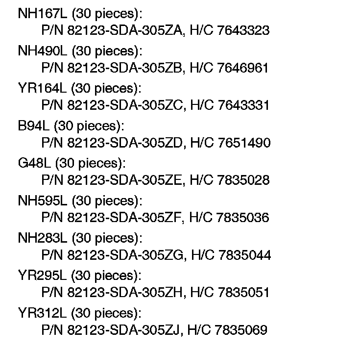For color information, refer to PIB A05-0005, Child Seat Anchor Buttons. Click PARTS, then click PARTS LIBRARY, then click Parts Bulletins. Select Child Seat Anchor Buttons from the list.