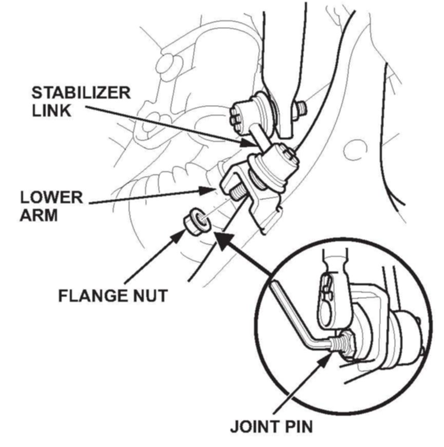3. Remove the flange nut while holding the joint pin with a hex wrench, and disconnect the stabilizer link from the lower arm.