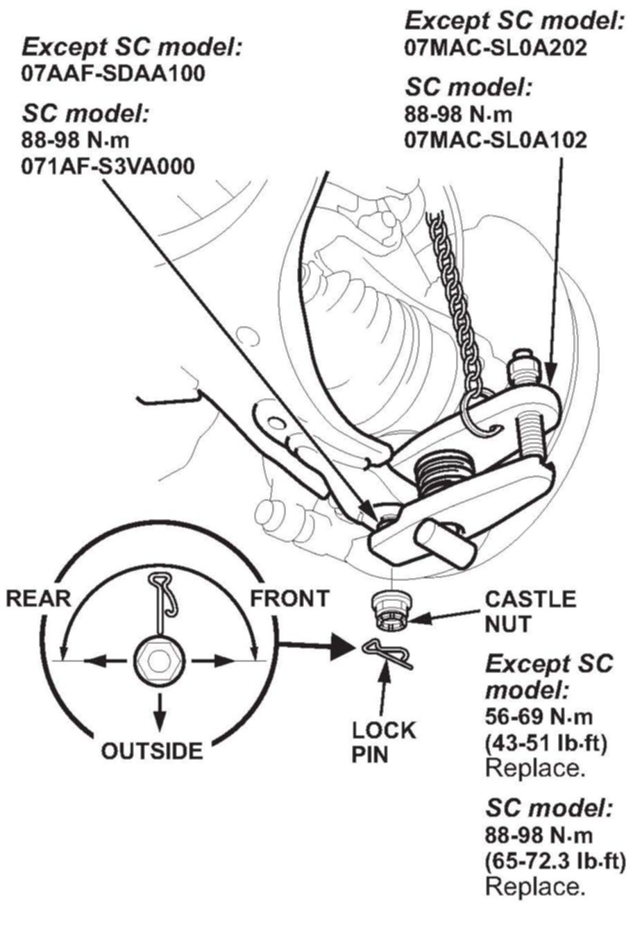 ^ Torque the castle nut to the lower torque specification, then tighten it only far enough to align the slot with the ball joint pin hole. Do not align the castle nut by loosening it.