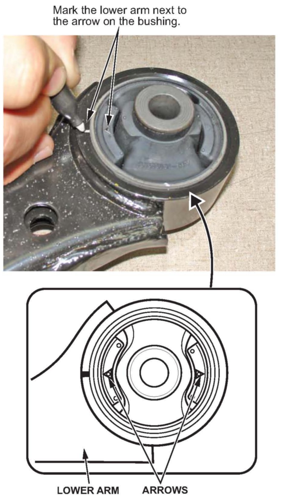 12. Mark the lower arm at the location of the arrow on the compliance bushing.