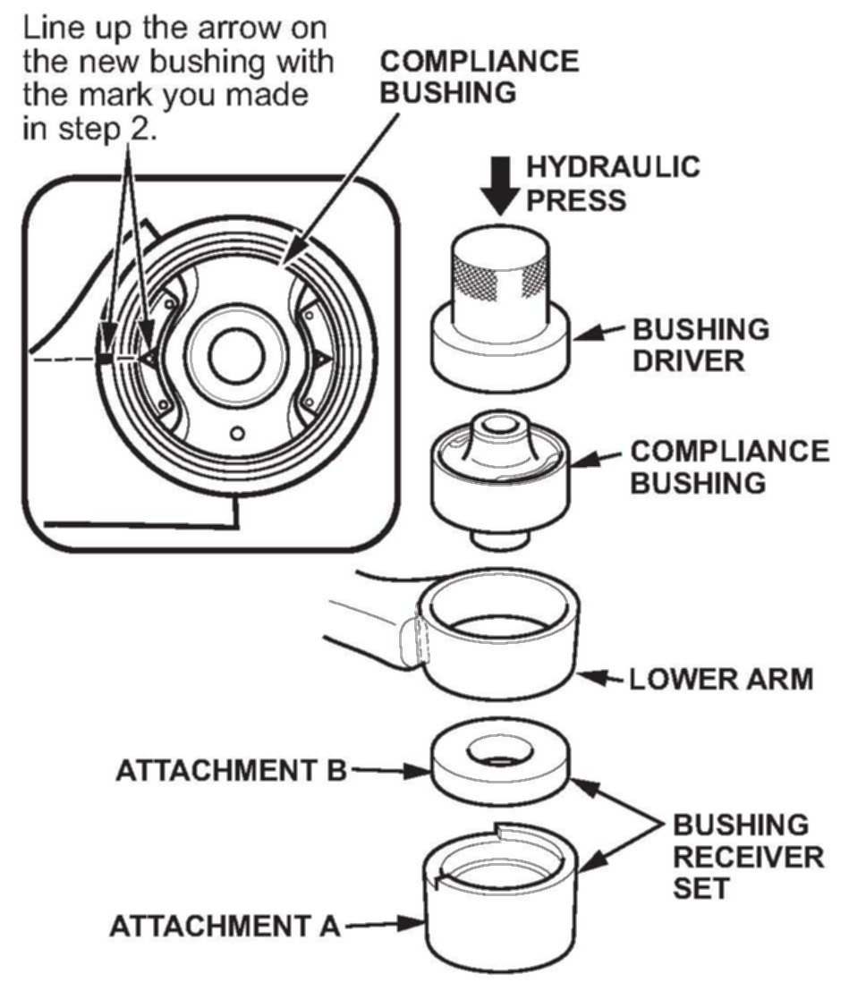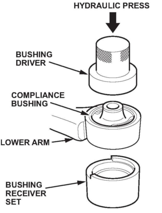 13. Press out the compliance bushing from the lower arm using the bushing driver, the bushing receiver set, and a hydraulic press.