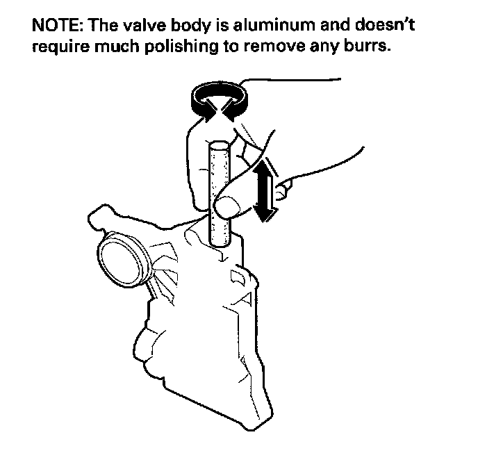 4. Roll up half a sheet of ATF-soaked # 600 paper and insert it in the valve bore of the sticking valve. Twist the paper slightly, so that it unrolls and fits the bore tightly, then polish the bore by twisting the paper as you push it in and out.