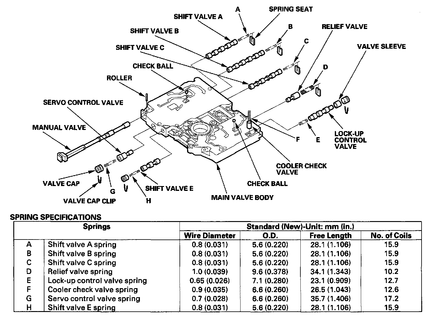 2. Install the valves and springs in the sequence shown for the main valve body, regulator valve body, and servo body. Refer to the following valve cap illustrations, and install each valve cap so the end shown facing up will be facing the outside of the valve body.