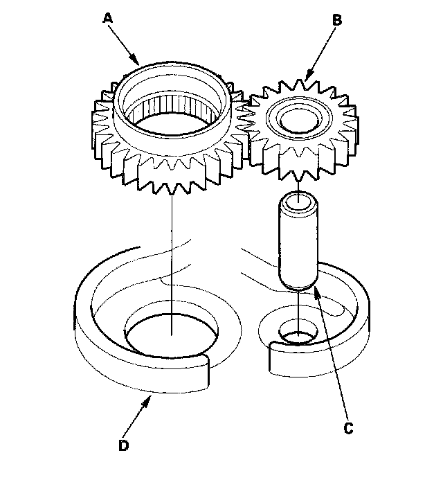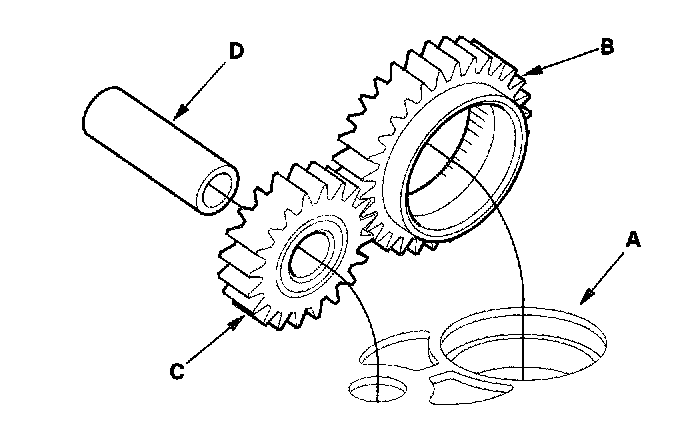 1. Install the ATF pump drive gear (A), driven gear (B), and ATF pump driven gear shaft (C) in the main valve body (D). Lubricate all parts with ATF, and install the ATF pump driven gear with its grooved and chamfered side facing up.