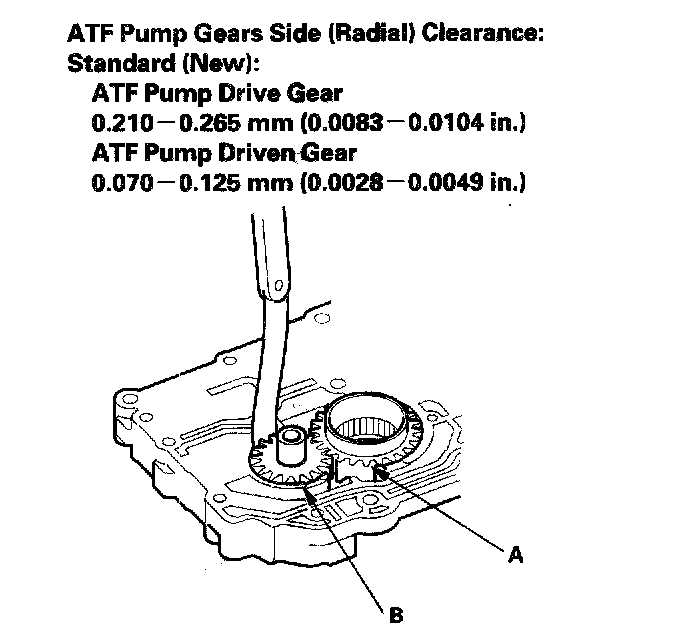 2. Measure the side clearance of the ATF pump drive gear (A) and driven gear (B).