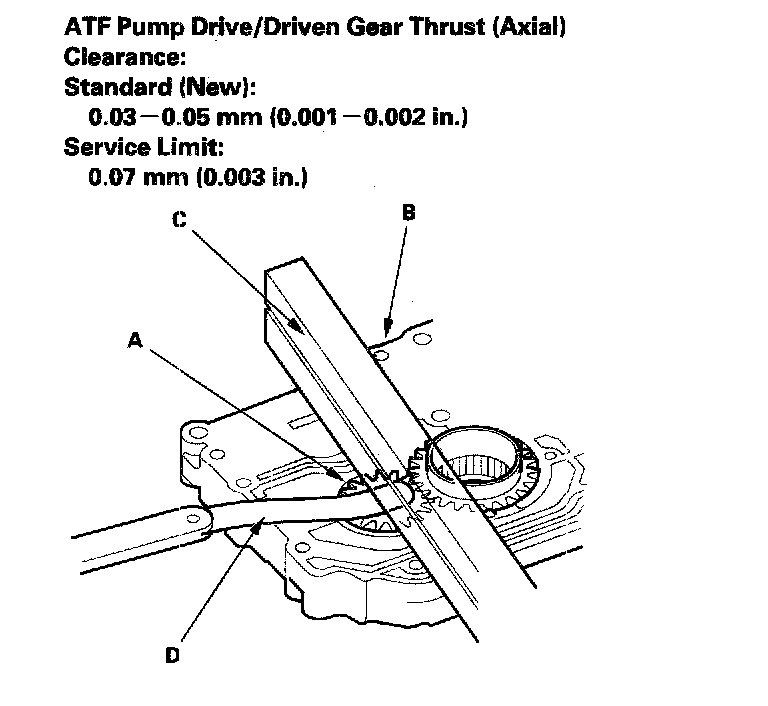 3. Remove the ATF pump driven gear shaft. Measure the thrust clearance between the ATF pump driven gear (A) and the valve body (B) with a straight edge (C) and a feeler gauge (D).