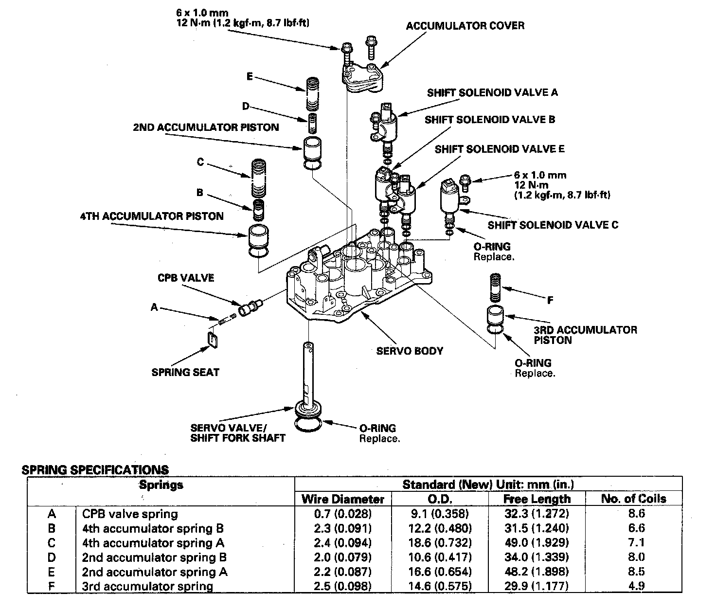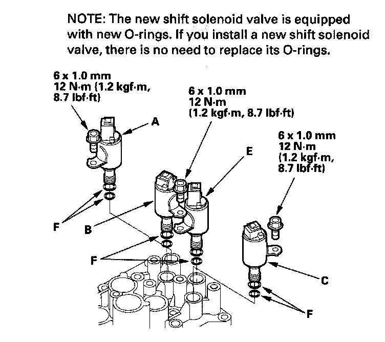 1. Install new O-rings (F) on each shift solenoid valve.