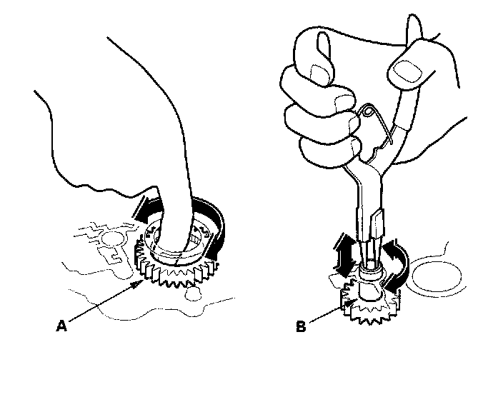 3. Make sure the ATF pump drive gear (A) rotates smoothly in the normal operating direction, and the ATF pump driven gear shaft (B) moves smoothly in the axial and normal operating direction.