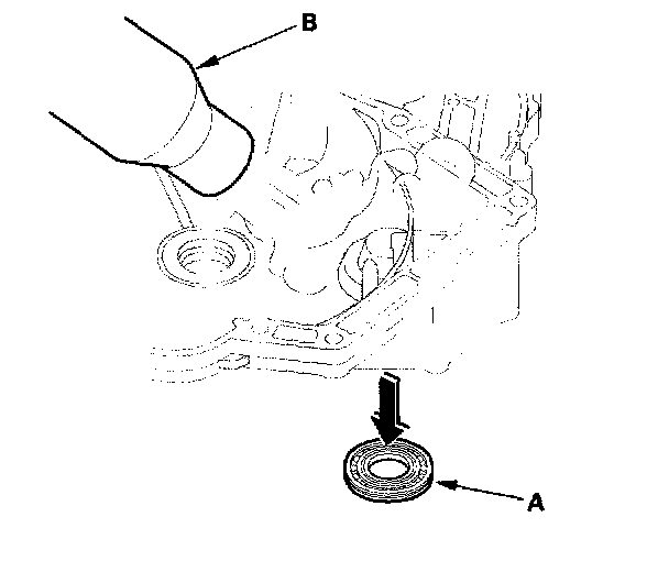 1. Remove the oil seal (A) from the torque converter housing (B).