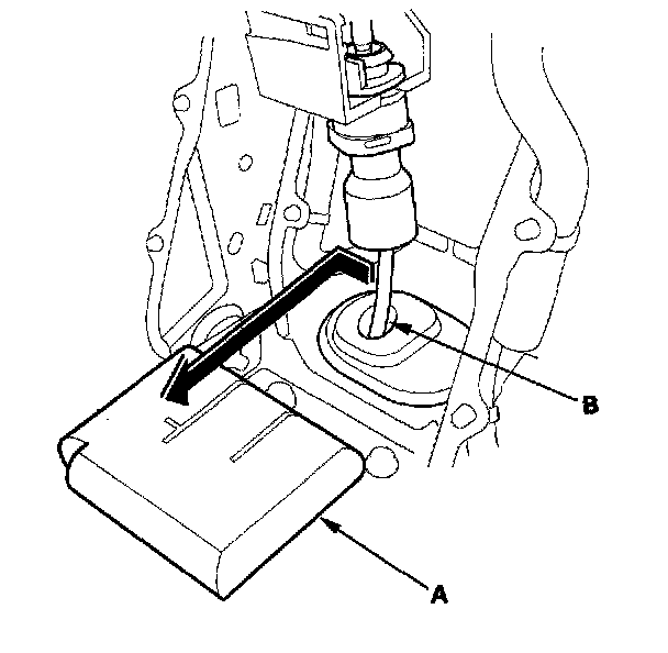 19. Pry the lock tabs on the back of the O/D switch/shift lock solenoid connector (A), and remove the back cover (B).