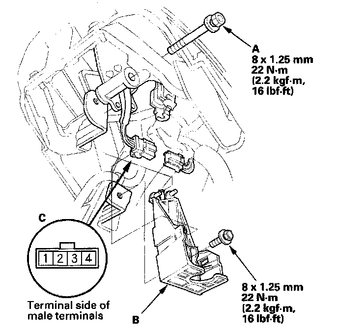 30. Install the O/D switch harness terminals (C) in the No. 1 and No. 2 cavities. Either O/D switch harness terminal can be installed in No. 1 and No. 2 cavities.