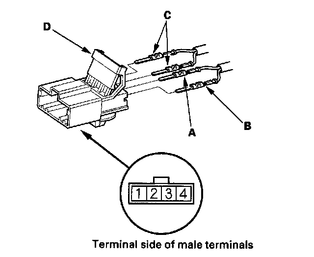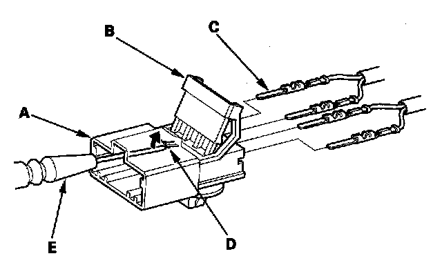 20. Remove the terminal (C) from the connector by pushing the lock tab (D) up in the connector using a thin blade screwdriver (E). Remove all four terminals.