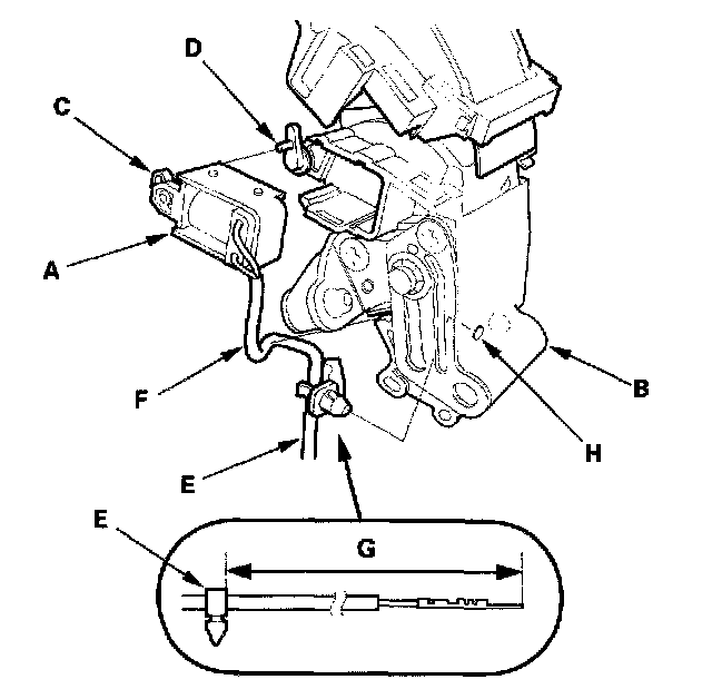 8. Rotate the socket holder (A) on the shift cable (B) a quarter turn; the tab (C) on the socket holder will be in the opening (D) of the shift cable bracket (E). Then slide the holder to remove the shift cable from the shift cable bracket. Do not remove the shift cable by twisting the shift cable guide (F) and damper (G).