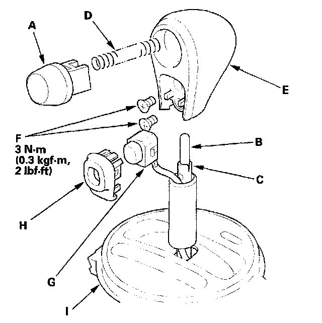 27. Install the O/D switch (G) and the O/D switch cover (H), and install the A/T gear position indicator panel (I) on the shift lever bracket.