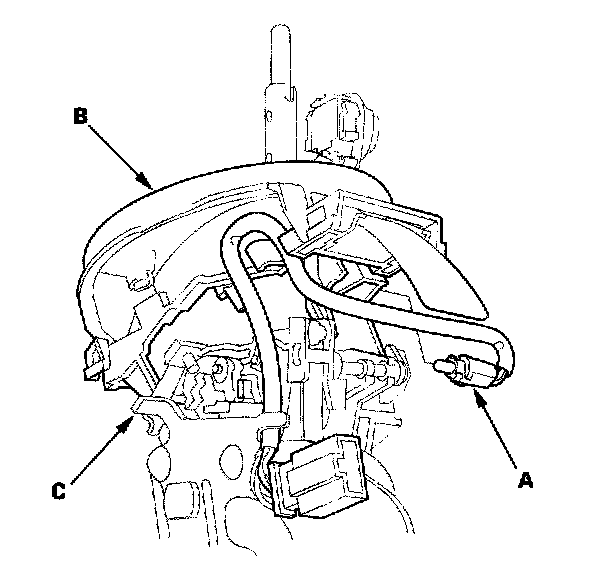 21. Install the A/T gear position indicator panel light socket (B), and install the connector (C).